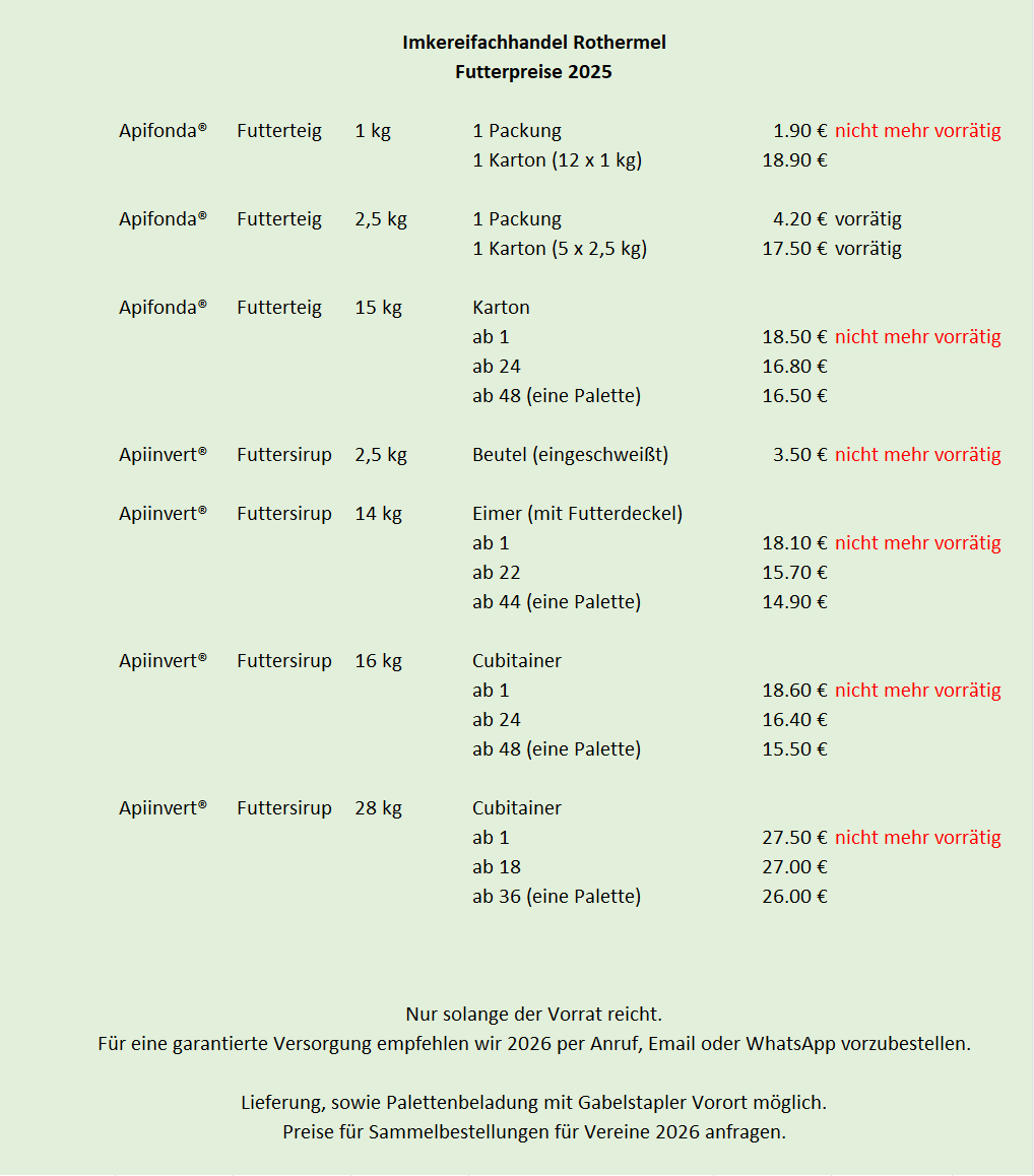 Hier findest du unsere Futterpreise für die Saison 2025. Größere Mengen nur nach Vorbestellung möglich. So lange der Vorrat reicht.
