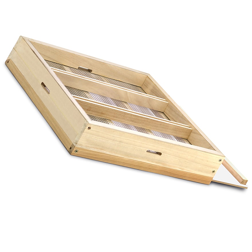 mit Edelstahl Varroagitter, Bodenschieber und drei Fluglöchern. Durch Einsatz der Trennschiede können bis zu drei Ableger in einer Zarge gebildet werden. Passend für Normalmaß