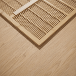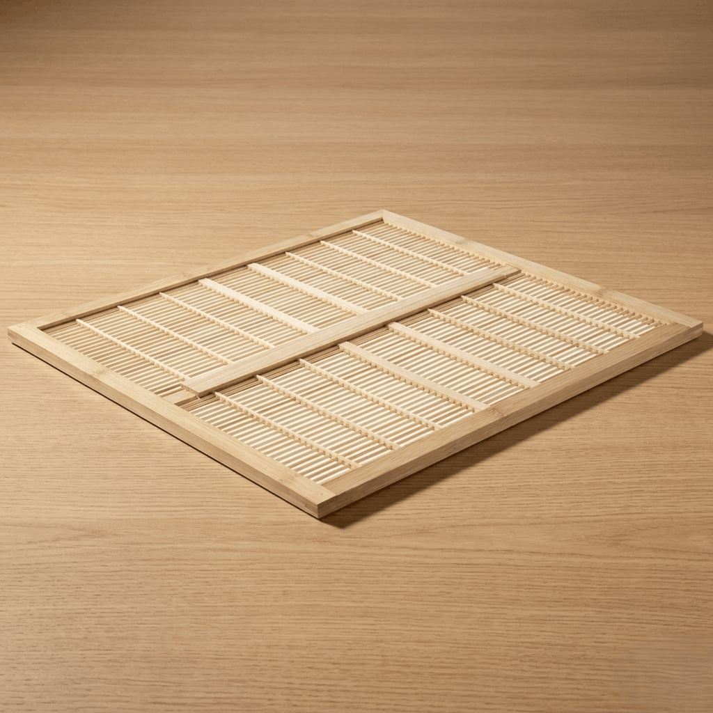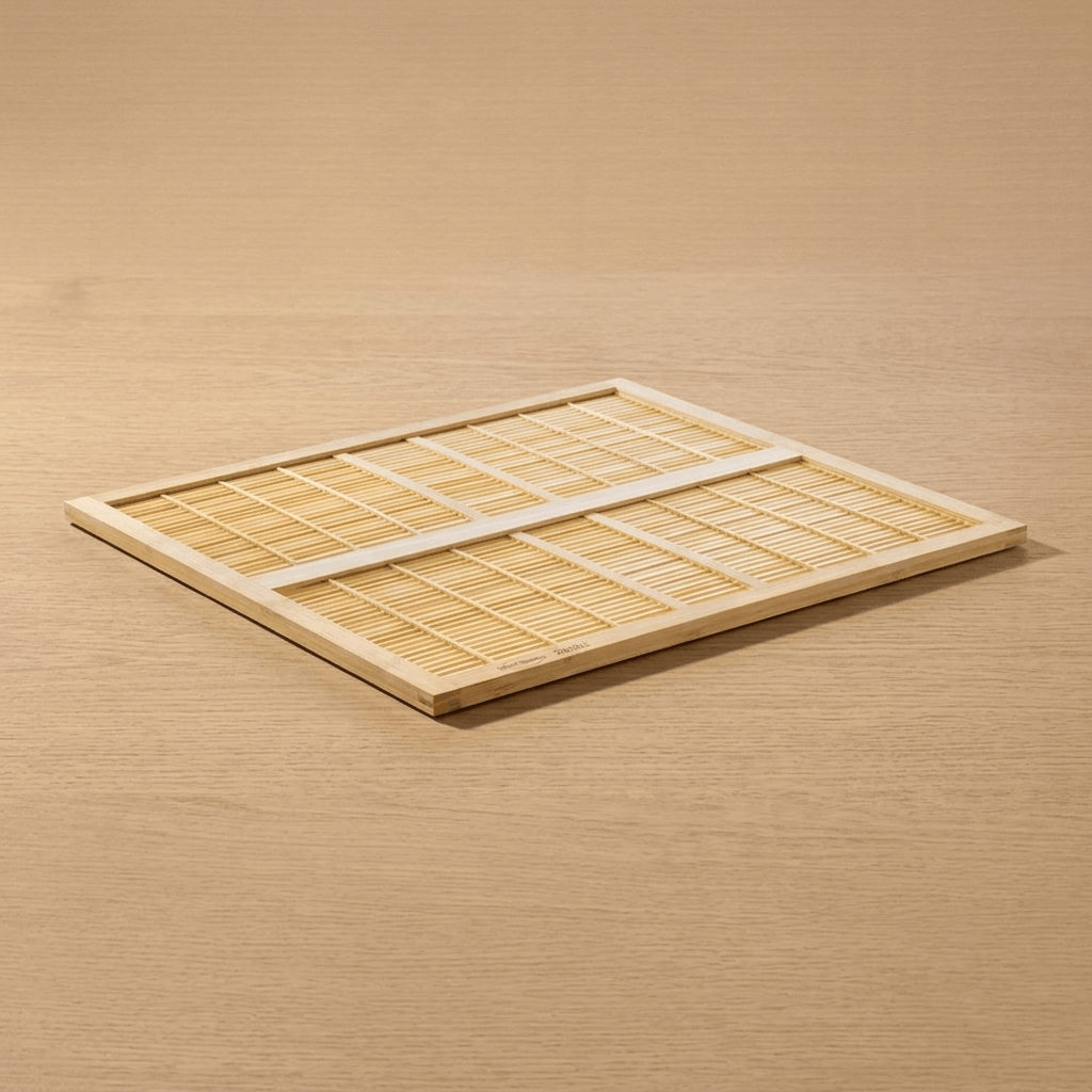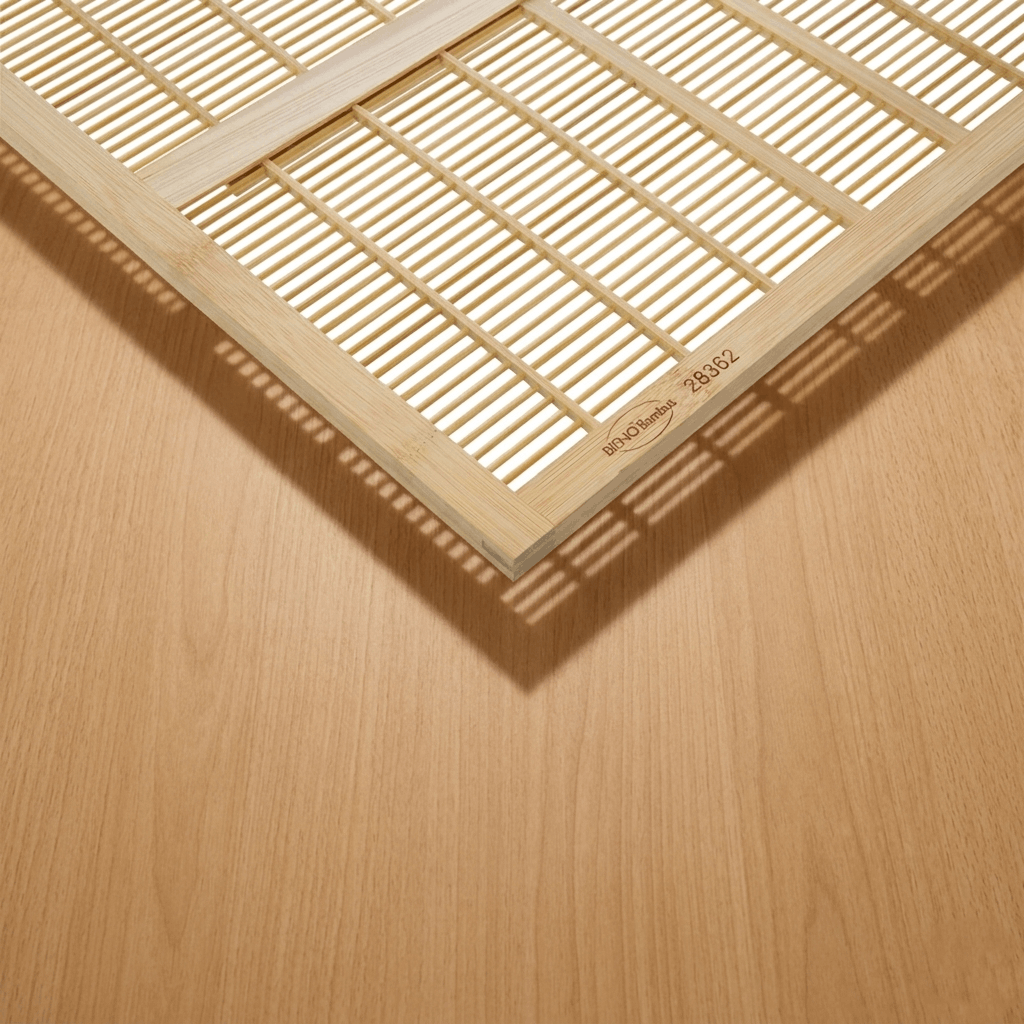 hergestellt aus 3 mm starken Bambus-Rundstäben mit einem Abstand von 4,2 mm, mittig eingefasst in einem 13 mm hohem Holzrahmen, Außenmaß ca. 465 x 420 mm