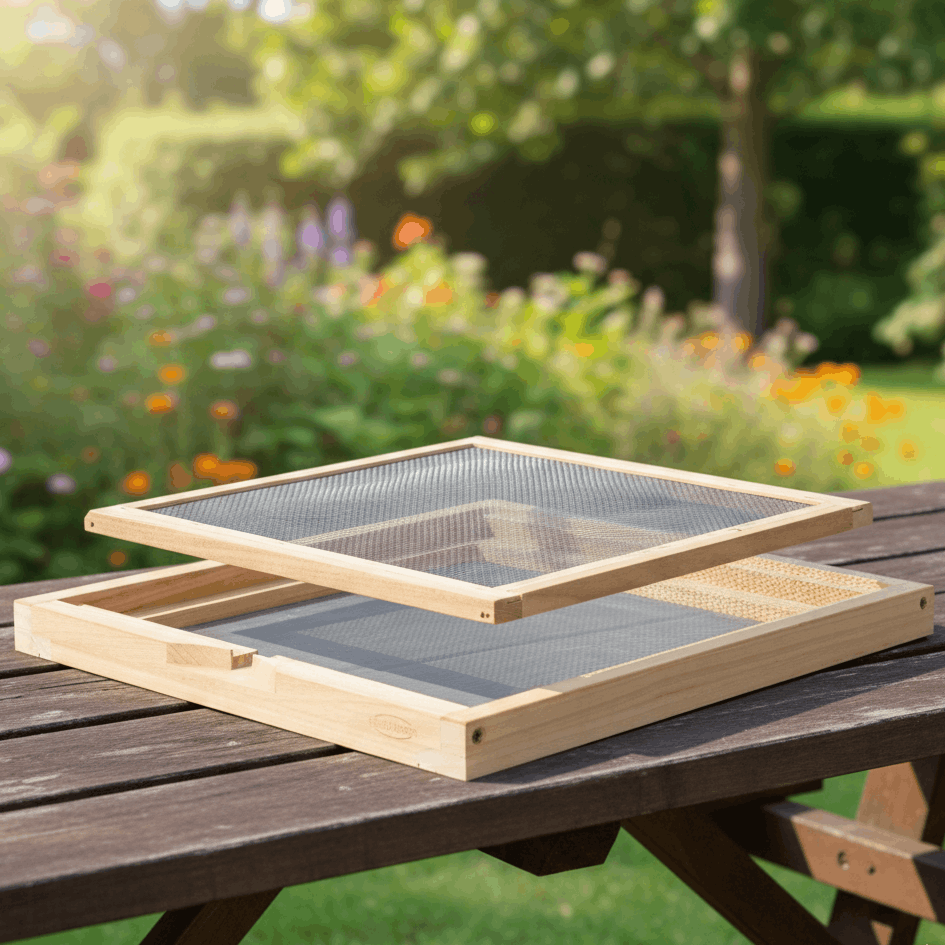 zweiteilig, bestehend aus einem Unter-Holzrahmen mit Flugloch und eingefasstem, feinem Edelstahlgitter und einem Ober-Holzrahmen mit eingefasstem Varroagitter