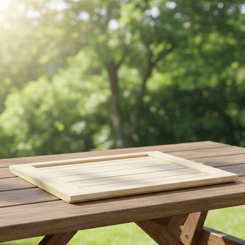 Vollholz-Bodendämmbrett mit Lüftungsschlitzen in Lamellenform. Diese sind in einem 45° Winkel angeordnet, sorgen für eine Luftzirkulation im Bienenvolk und verhindern Lichteinfall. Der Einsatz erfolgt alternativ zum Bodenschieber zur Be- und Entlüftung