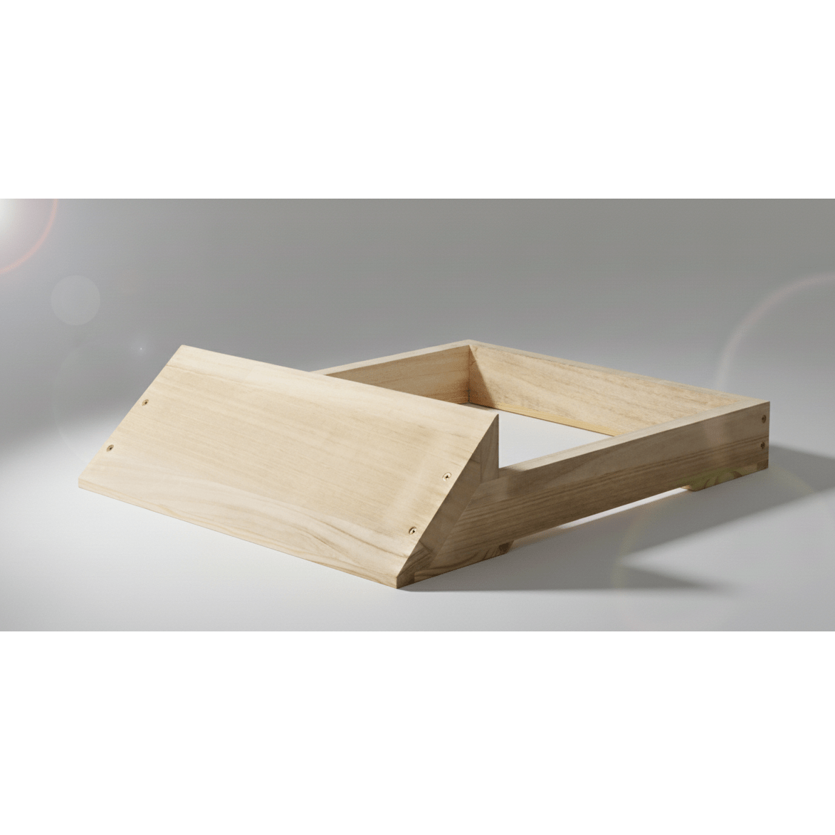 zur erhöhten Aufstellung des Flachbodens. Gleichzeitig ergibt sich ein zusätzlicher Anflug für die Bienen von 17 cm. Länge 57 cm, Breite 44,5 cm, Höhe 13 cm, Gewicht ca. 1,2 kg