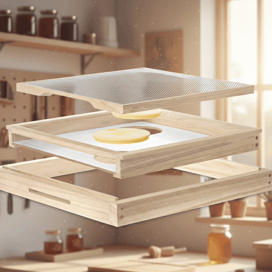 bestehend aus Doppel-Holzrahmen mit Flugloch, herausnehmbarer Zwischenbodenplatte mit zwei Spundlöchern, Abdeckungen und runden Bienenfluchten, Drahtrahmen mit Lüftungsgitter. Somit 6-fach nutzbar: Fluchtschied, Zwischenboden mit Rüsselkontakt, geschlossener Zwischenboden, Oberlüfter, Oberflugloch und Futtergitter