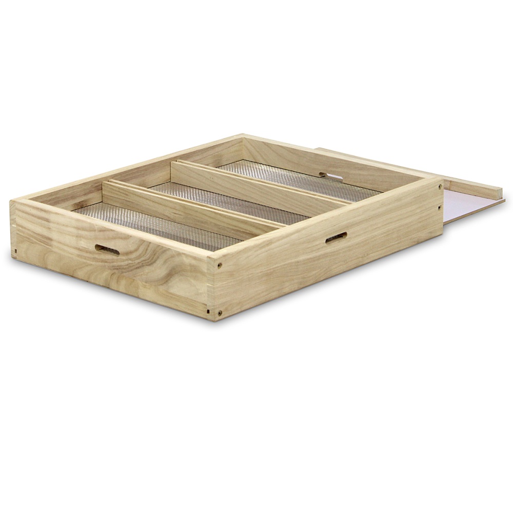 mit Edelstahl Varroagitter, Bodenschieber und drei Fluglöchern. Durch Einsatz der Trennschiede