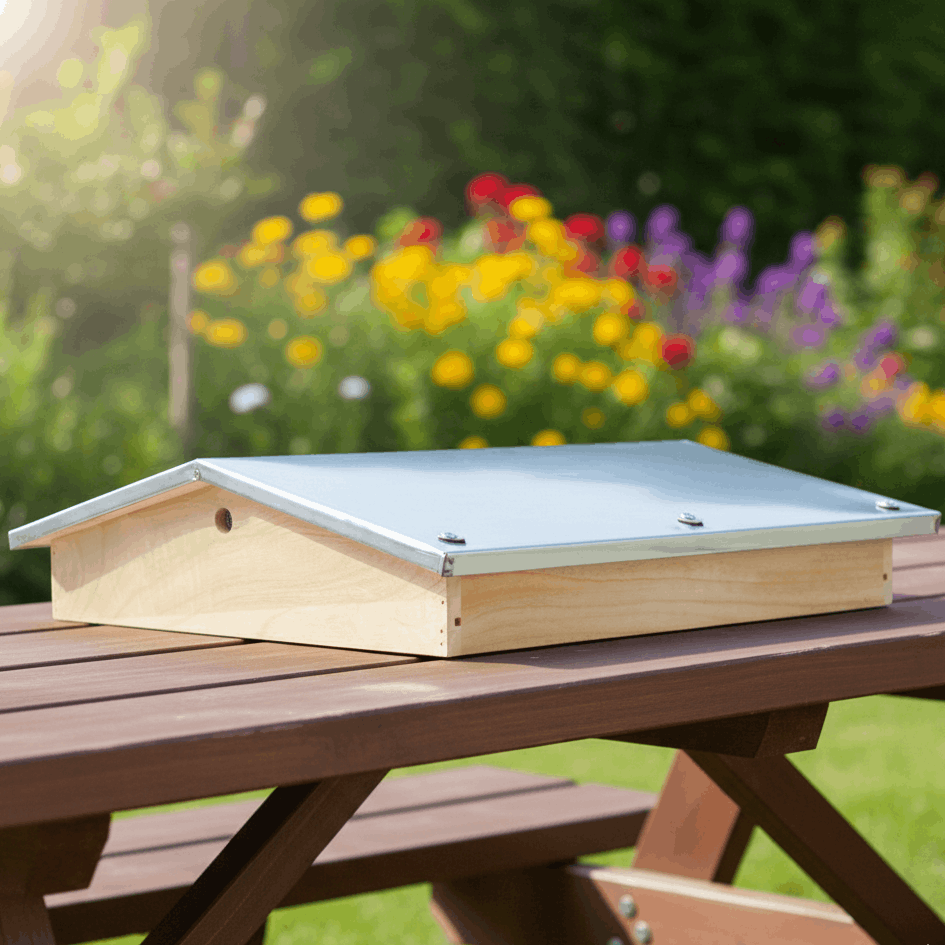 wird direkt über den Innendeckel bzw. die Zarge gestülpt und ersetzt den Außendeckel. Massiv und aus astfreiem Holz. Mit Edelstahl-Haube und umlaufendem Dachüberstand. Besonderheit: Die Edelstahl-Abdeckung ist aus einem Stück hergestellt und nicht durch eine Mittelnaht durchtrennt.