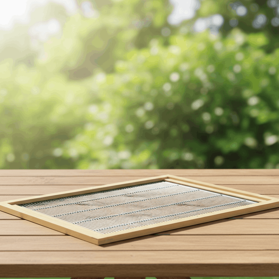 verzinktes Metall-Absperrgitter 394 x 456 mm, im Holzrahmen genietet und mit zwei Leisten vor Verrutschen gesichert.