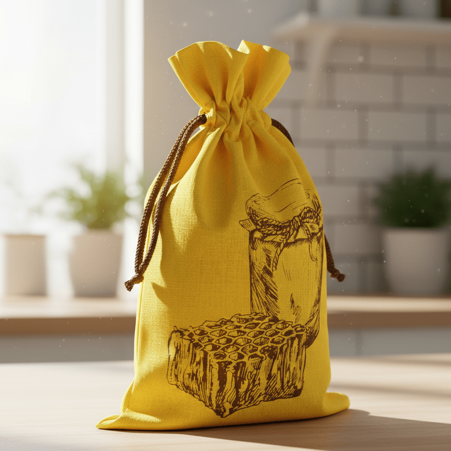 Beutel aus gefärbter Baumwolle mit Aufdruck „Honig“ und Kordel-Zugverschluss