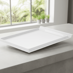 aus weißem Kunststoff, stabil und kochfest, mit umlaufender Erhöhung als Auffangwanne,
