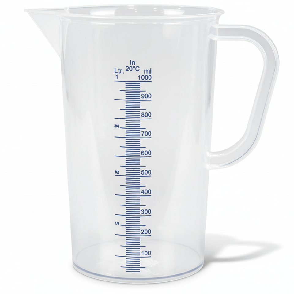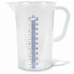 aus durchsichtigem Kunststoff mit Ausgießtülle und erhabener Messskala in 10 ml Schritten