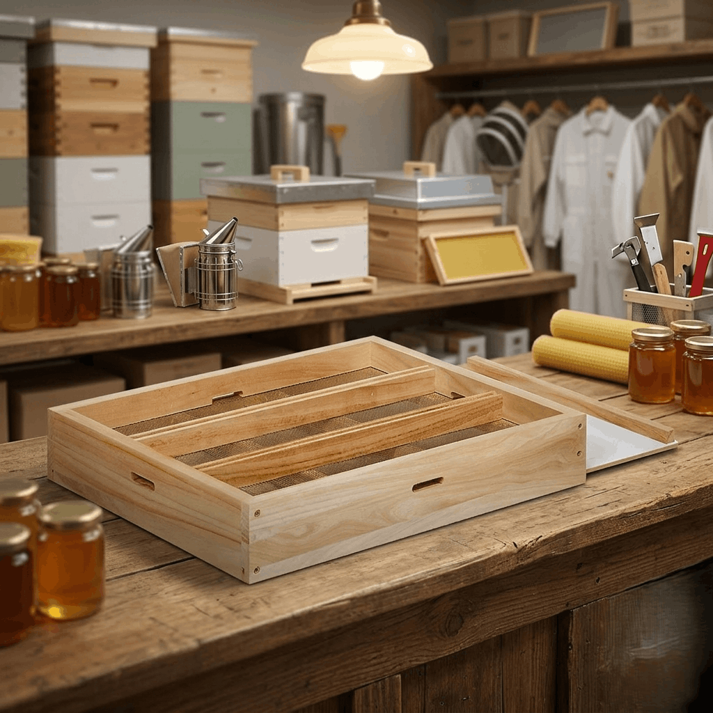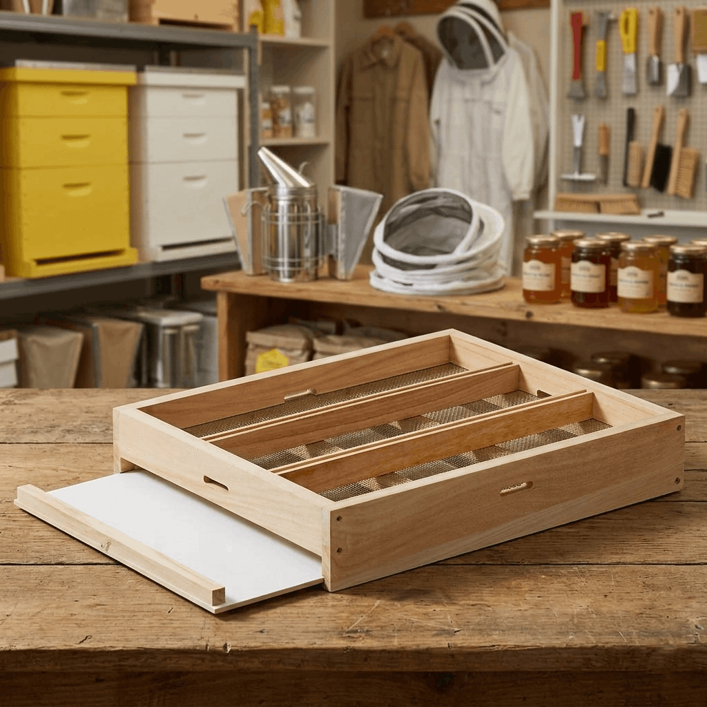 mit Edelstahl Varroagitter, Bodenschieber und drei Fluglöchern. Durch Einsatz der Trennschiede Zander Artikel 2383, ZaDant oder Zander Anderthalb können bis zu drei Ableger zu je 3 Waben in einer Zarge gebildet werden