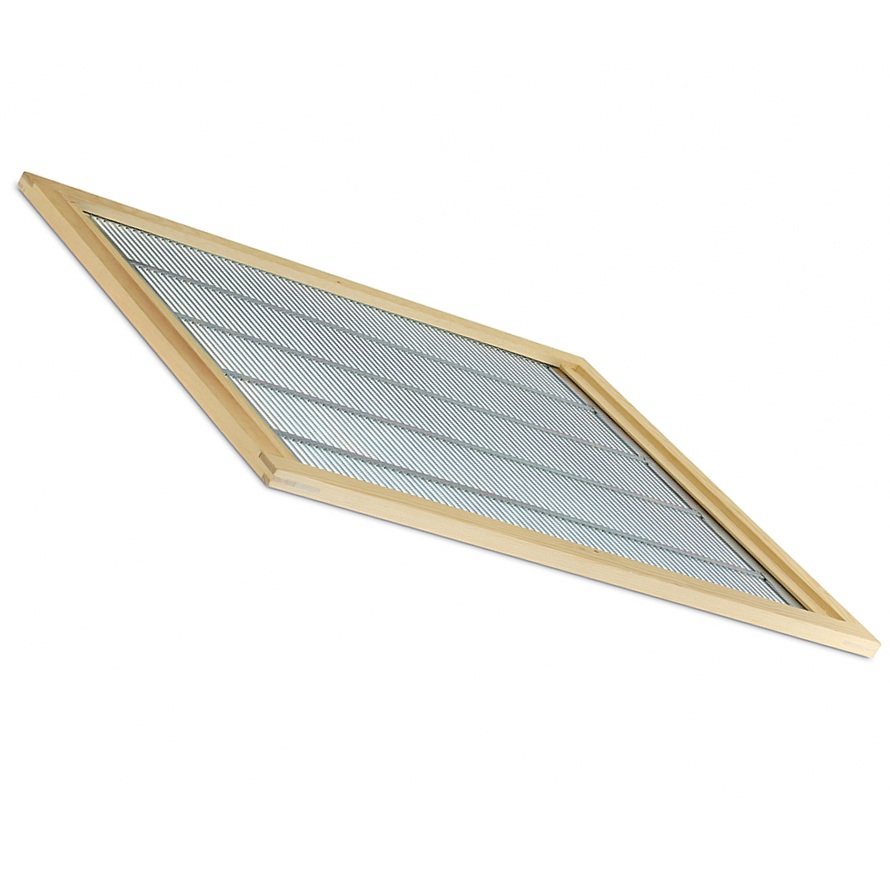 verzinktes Metall-Absperrgitter 394 x 456 mm, im Holzrahmen genietet und mit zwei Leisten vor Verrutschen gesichert.