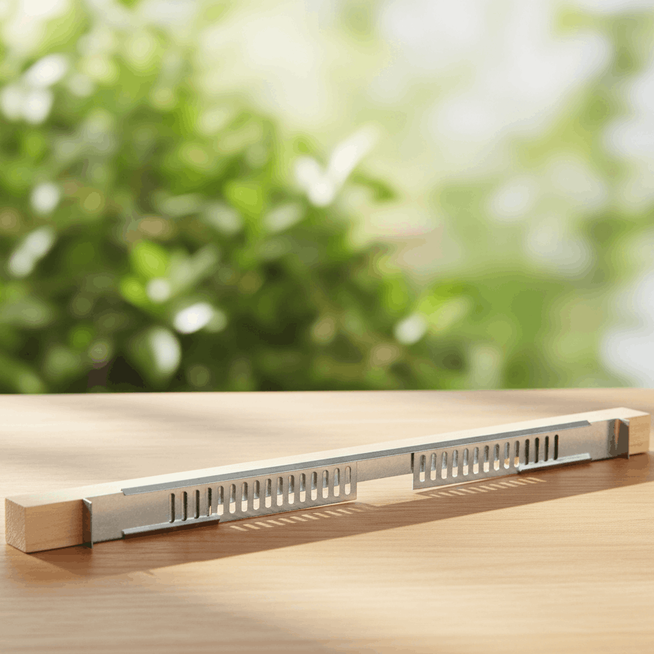 Holz-Fluglochkeil mit 8 mm Mäuseschlitz von 19 cm Länge und zusätzlichem fest montiertem, verzinktem Fluglochschieber von 30 cm Länge