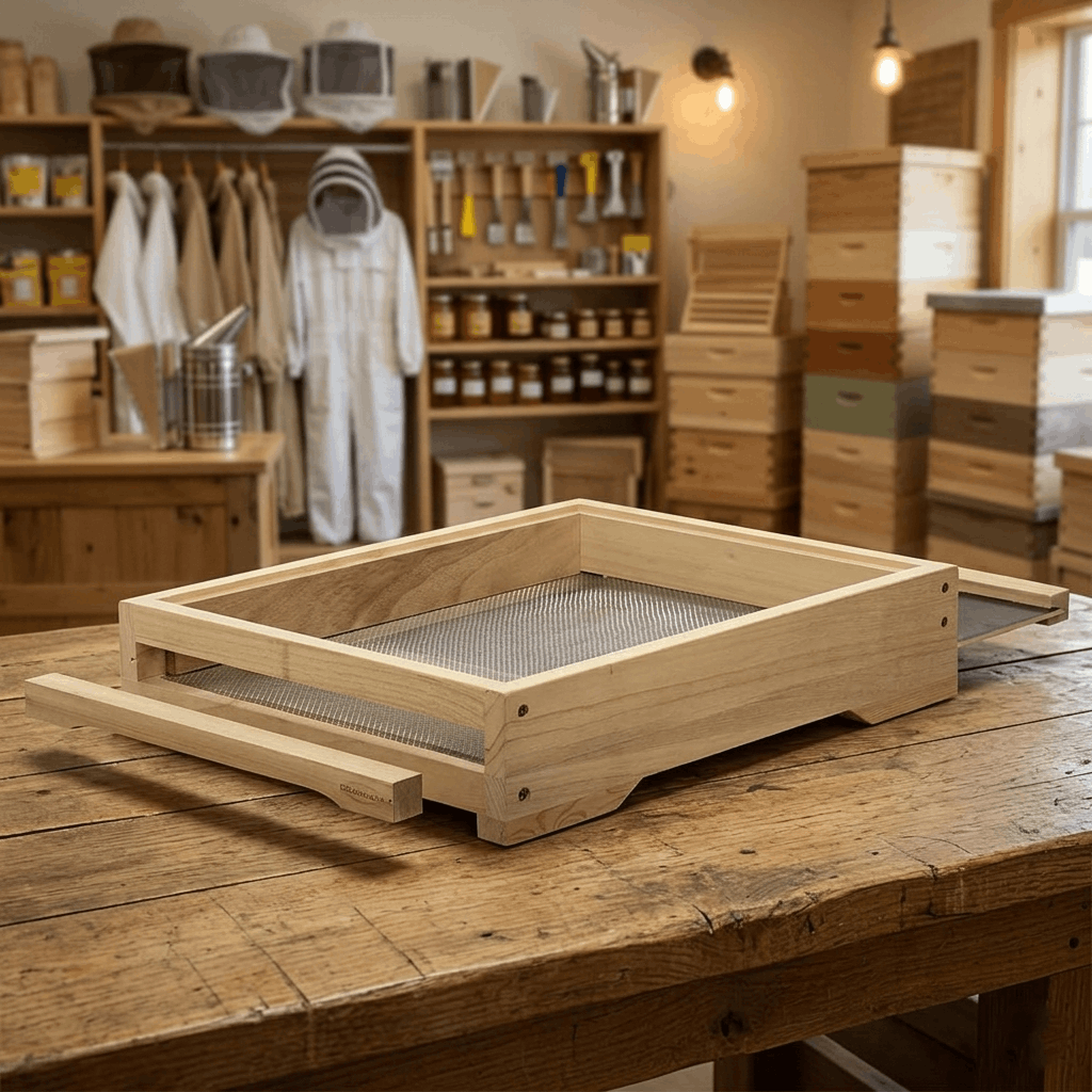 - Kompakter, massiver Holzboden mit Edelstahl Lüftungsgitter und seitl. Griffmulden nach Imkermeister Werner Schundau
