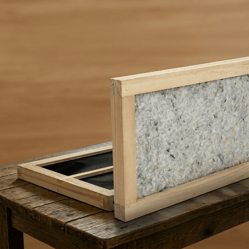 hergestellt aus einem 40 mm starkem Holzrahmen mit einer integrierten Dämm-Filzmatten-Füllung. Unterseitig abgeschlossen durch die atmungsaktive und diffusionsoffene Imgut® Lotus-Abdeckung