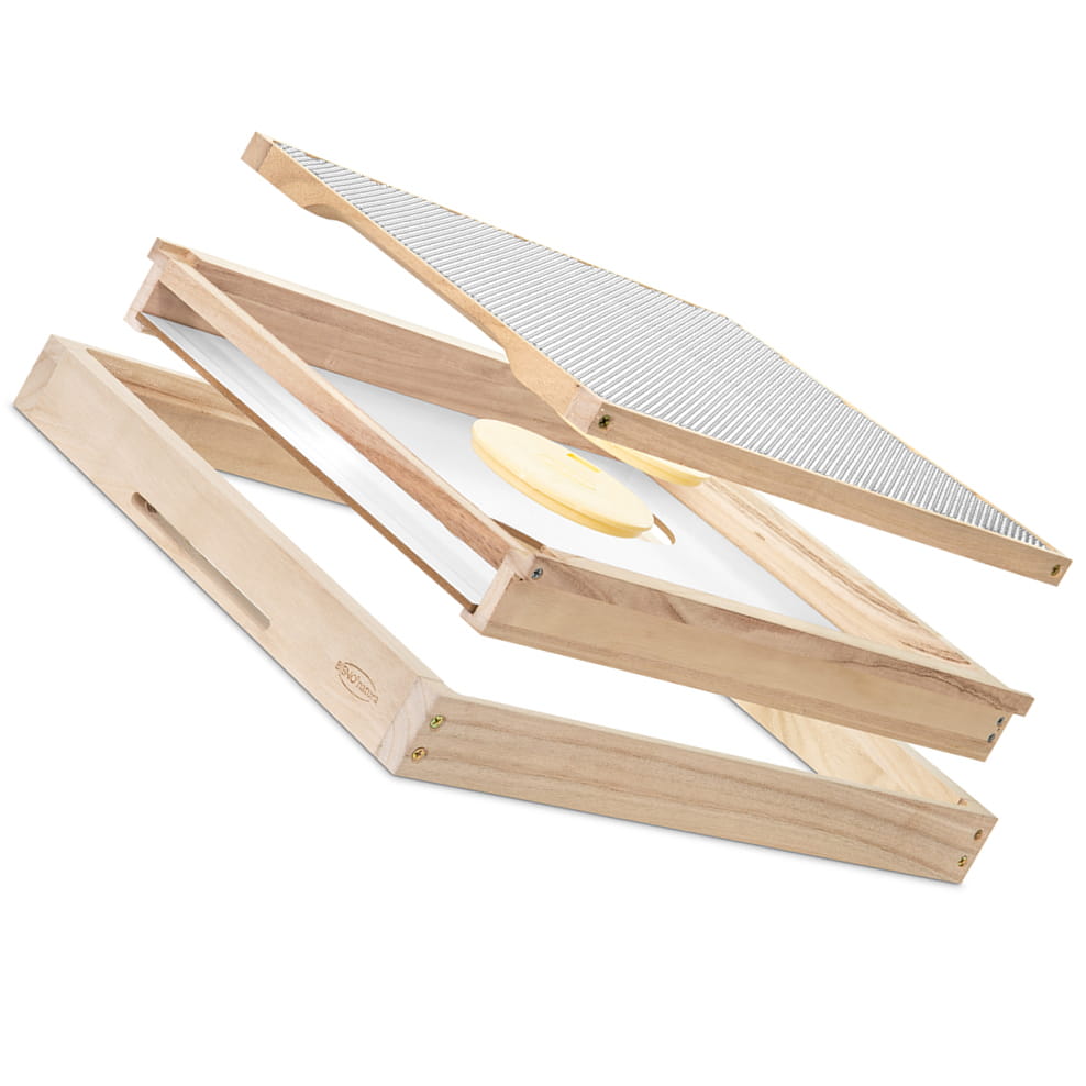 bestehend aus Doppel-Holzrahmen mit Flugloch, herausnehmbarer Zwischenbodenplatte mit zwei Spundlöchern, Abdeckungen und runden Bienenfluchten, Drahtrahmen mit Lüftungsgitter. Somit 6-fach nutzbar: Fluchtschied, Zwischenboden mit Rüsselkontakt, geschlossener Zwischenboden, Oberlüfter, Oberflugloch und Futtergitter