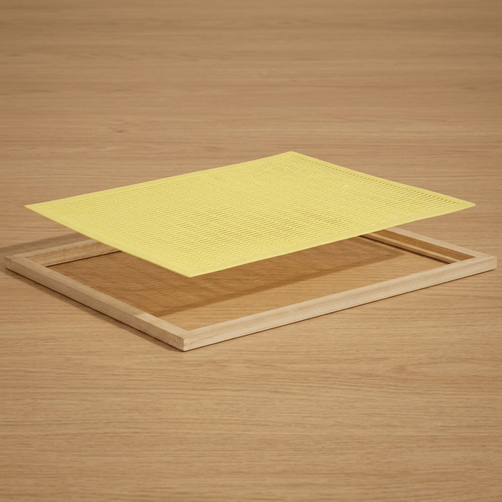 in einem eckverzinktem Holzrahmen,