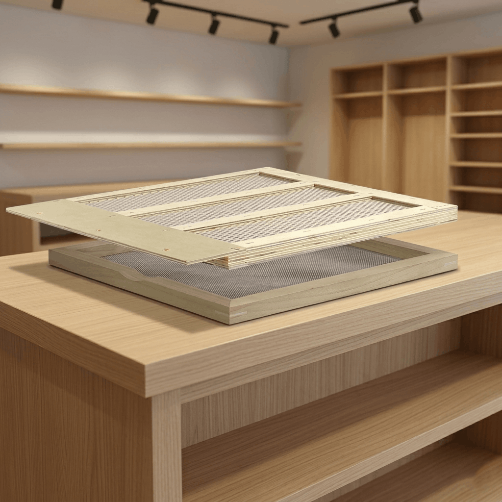 bestehend aus großflächigem Pollenkamm aus Kunststoffgewebe mit Ø 5 mm Löcher und Pollen-Auffangrahmen. Beide Rahmen werden durch die hintere Arbeitsklappe eingeschoben, ohne den Kasten zu öffnen