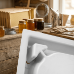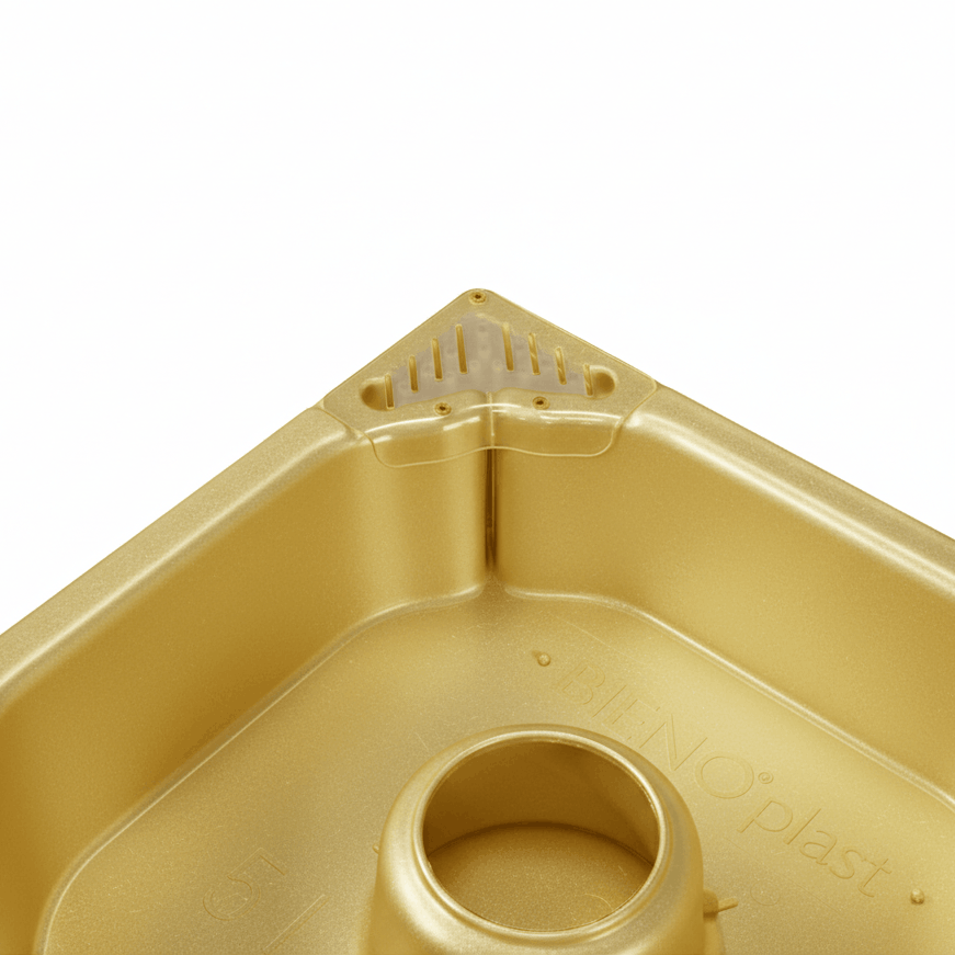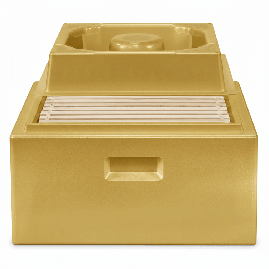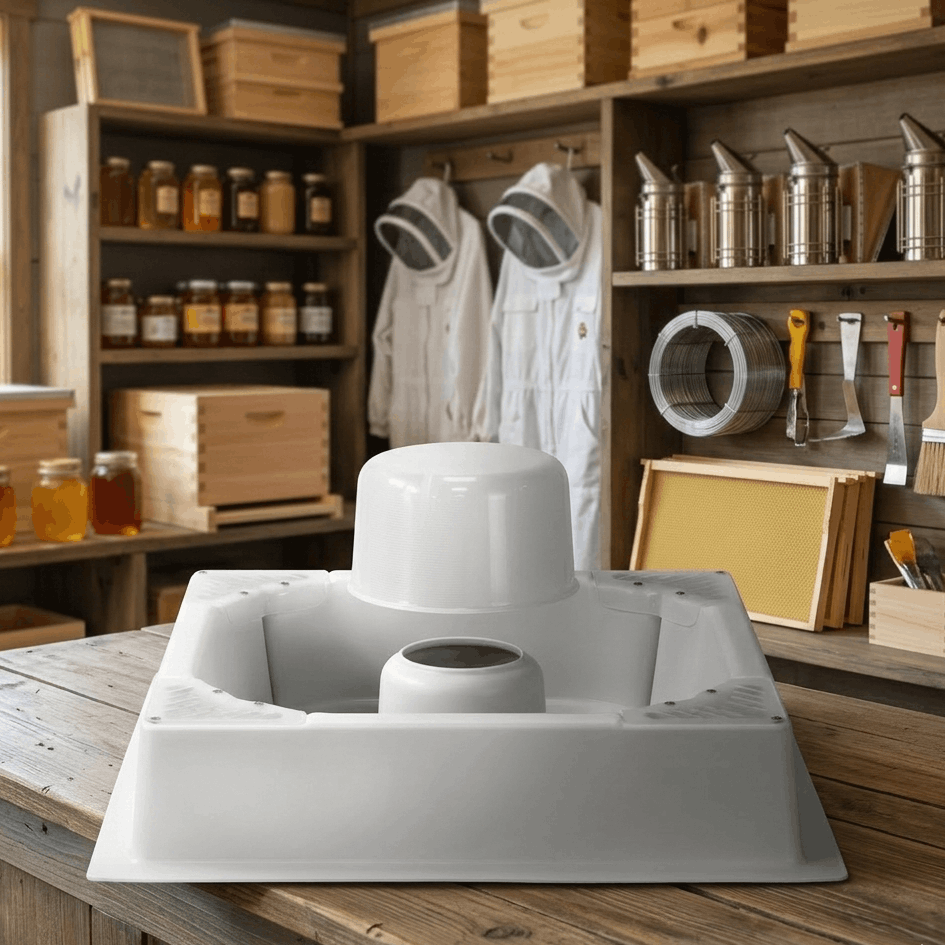2-teilig, quadratischer Futtertrog zum Einsatz in einer Leerzarge. Ausgestattet mit einem Bienenaufstieg über einen zentralen Dom und zusätzlich mit 4 weiteren Eck-Aufstiegen ausgestattet mit Kletterlamellen.