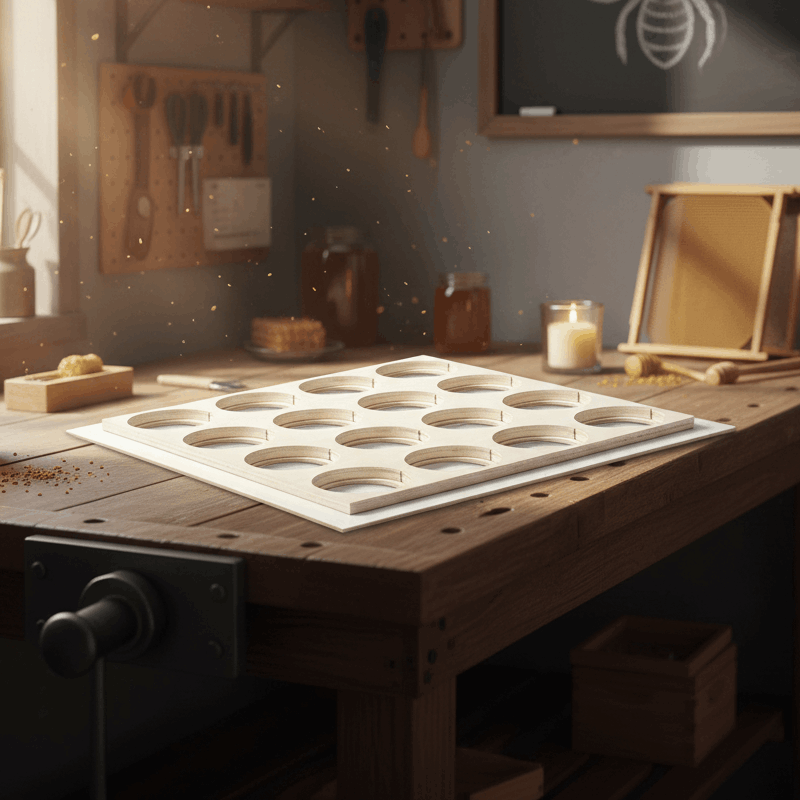 die Lochplatte wird auf den Rähmchen einer Zarge aufgelegt und mit leeren Gläsern bestückt. Anschließend wird eine weitere Leerzarge darüber platziert. Im Laufe der Zeit bauen die Bienen diese Gläser mit Wabenhonig aus. Der Gläsereinsatz ist geeignet für 16 Gläser Neutral, TO oder Deep mit einer Deckelöffnung von 78 bis 82 mm – ideal für 500 g bis 1.000 g Gläser