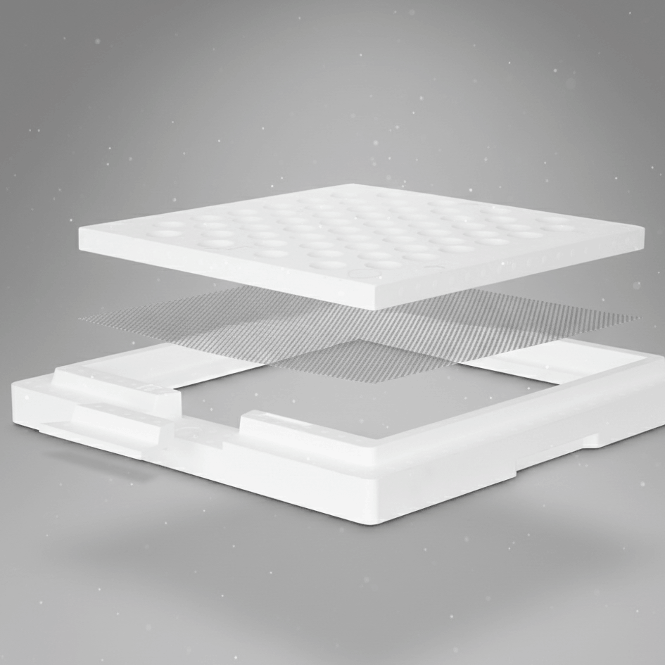 Nutzbar als Belüftung beim Wandern mit Aluminium Lüftungsgitter eingelegt im Styropor® Rahmen mit darüber platzierter Lochplatte, gegen Verbrausen. Außerdem nutzbar als Oberflugloch, Zwischenboden mit Rüsselkontakt und Futtergitter. Außenmaß 50 x 50 cm, Höhe 5,5 cm