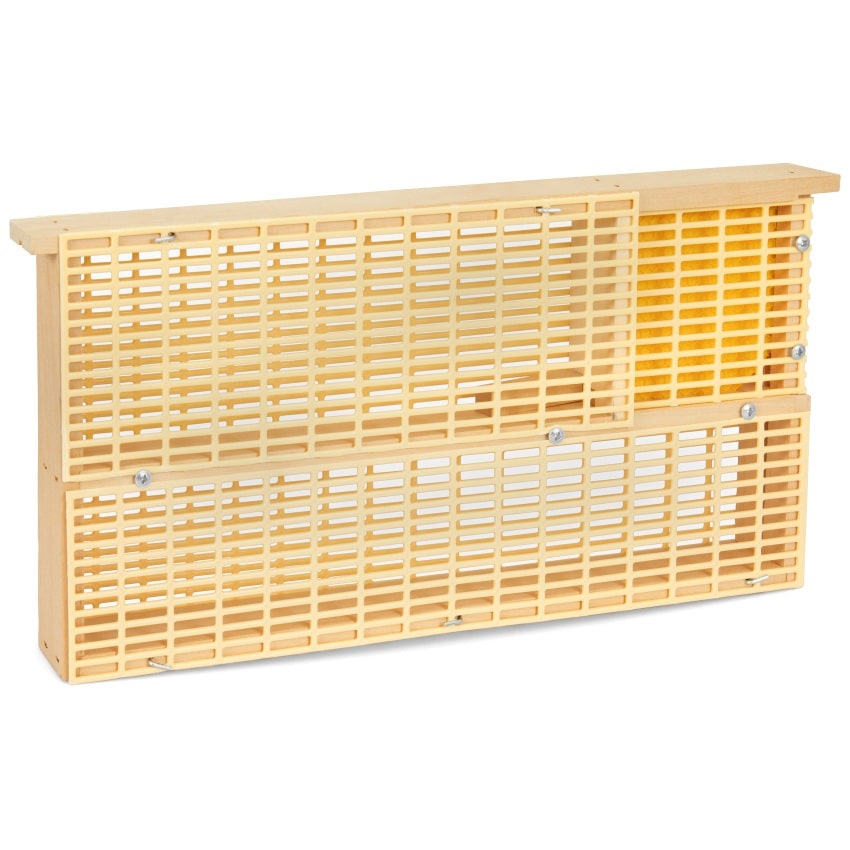 - Sperrbereich (oben klein): Mit stabiler Kunststoff-Mittelwand, die von den Bienen nicht verändert werden kann