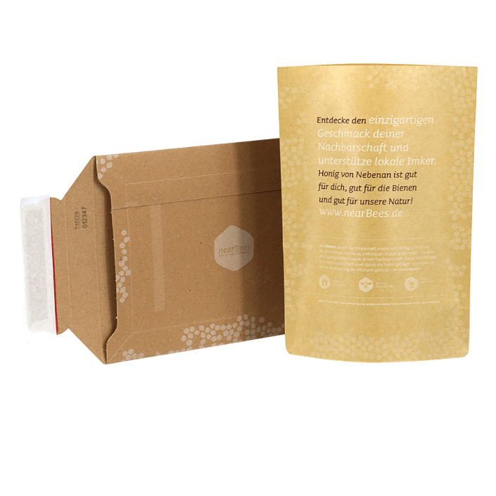 Alternative zu Kunststoffverpackungen oder Gläsern. Der flüssige Honig kommt direkt in die undurchlässigen Papierbeutel und danach wenn gewünscht in die Wellpappen-Versandtasche für den Postversand.