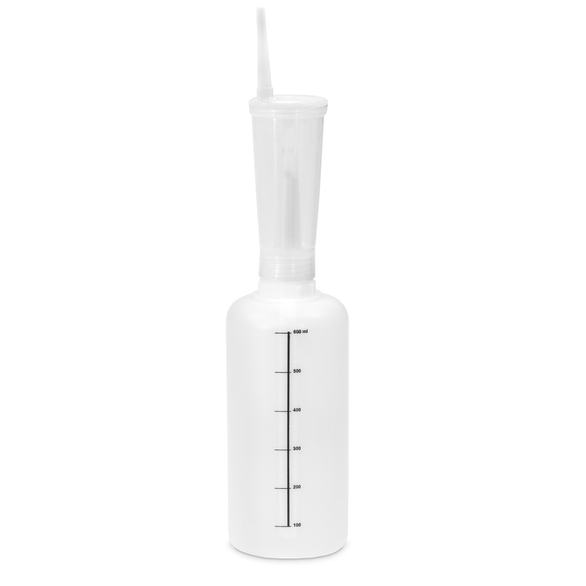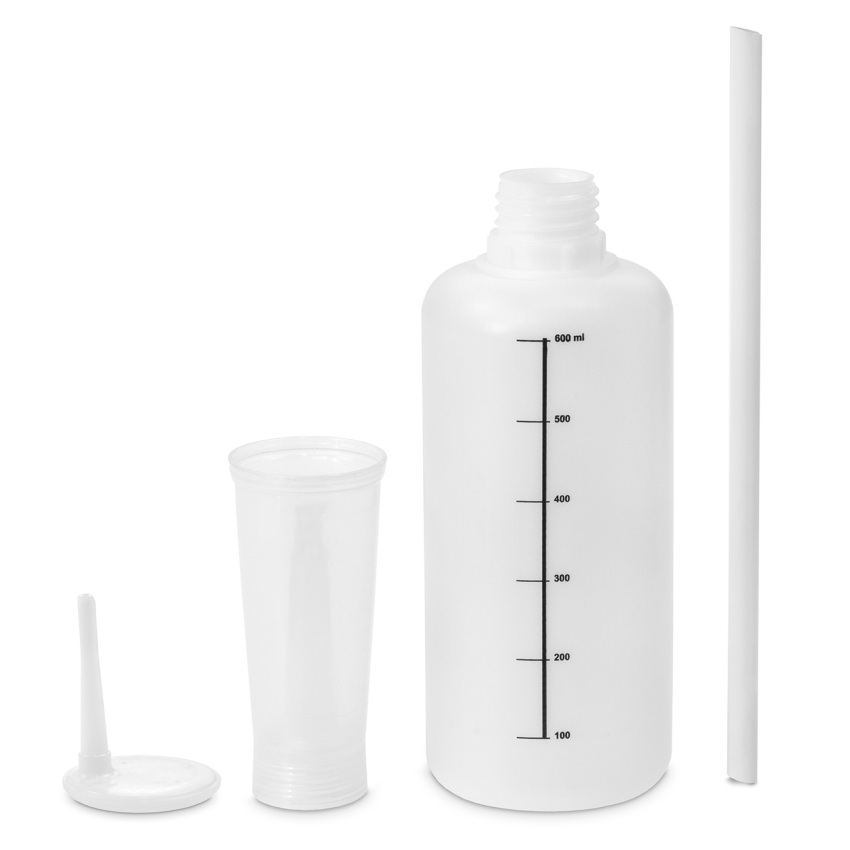 aus Kunststoff zum Dosieren und Verteilen von Flüssigkeiten. Durch das Zweikammernsystem lässt sich das Gerät auch mit einer Hand zum Beimischen von flüssigen Adaptiven nutzen.
